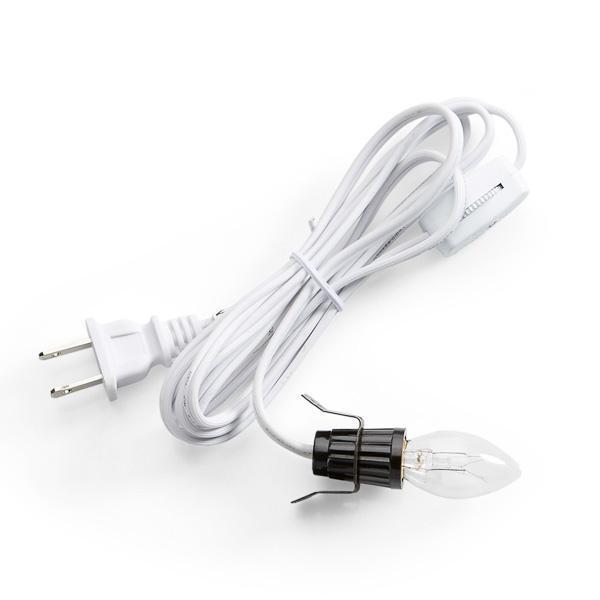 The easy-to-use clip-in light kits are white and consist of a cord with on/off switch, 7 watt bulb, and clip-in kit for the bulb. They are used in our Vintage Trees as well as other light up bisque designs.